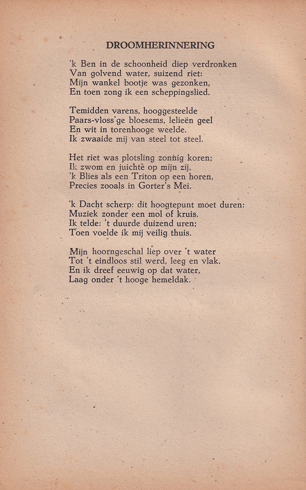 Dat is ook het geval in het gedicht van deze week waarin in eenvoudige taal droom en werkelijkheid samenkomen in een muzikale belevenis. Het noemen van Gorter in het gedicht is een expliciete verwijzing naar de dichtkunst van de tachtigers, waarvan de invloed duidelijk aanwezig is.