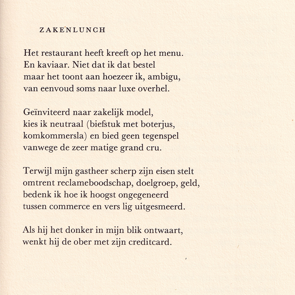 Het gedicht beschrijft ironisch, soms sardonisch de tweestrijd tussen dichten en reclameschrijven die de schrijver ervaart. Hij is weliswaar ook gericht op zijn (betalende) gastheer, maar de schrijver houdt op non-verbale wijze de regie ( zie de laatste twee regels).